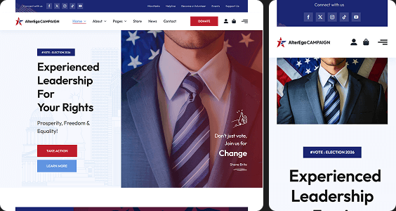 Политическая кампания / предвыборный сайт. Агитация за голосование, программа по работе, здравоохранению, равенству, экономическому росту; призывы к волонтёрству, донатам и объединению.